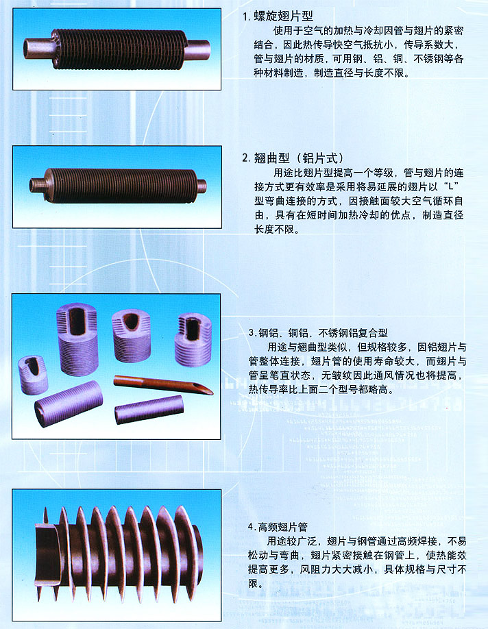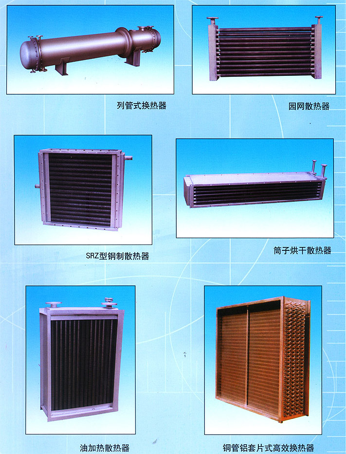 目前我廠散熱器的主要品種有:高溫水或蒸汽散熱器(GL型、SRZ型、S型、U型、SRL型、L型等)、高溫導(dǎo)熱油散熱器(FUL型)、表面空氣冷卻器(KL型、TL型)、油冷卻器(FL型)、鋁制串片式暖氣片、空氣冷卻器等。翅片管型式有:繞片式、擠壓式、串片式、焊片式等。翅片管材有:鋼、銅、不銹鋼、鋼鋁復(fù)合、銅鋁復(fù)合等。我廠除定型產(chǎn)品外還可為用戶設(shè)計(jì)制造各種非標(biāo)準(zhǔn)型散熱器和烘干設(shè)備。